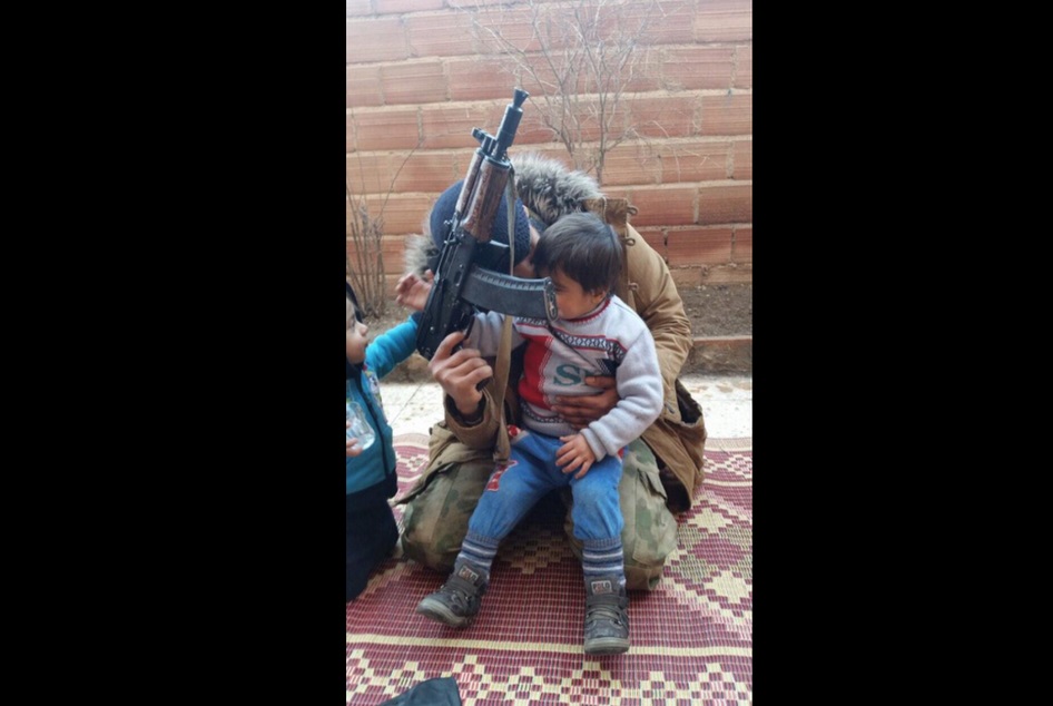 Το παρανοϊκό κάθαρμα, που πήρε το παιδί από την οικογένειά του, οι οποίοι μπορεί και να είναι νεκροί, φωτογραφίζει το νήπιο να κρατά όπλα, να ποζάρει με το δάχτυλο υψωμένο και να χαμογελά, το άμοιρο, δίχως να συνειδητοποιεί ακόμα ότι βρίσκεται στην αγκαλιά του μακελάρη που το άρπαξε από την αγκαλιά της μάνας του για να το κάνει σκλαβάκι του.